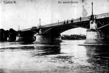 Pan Radca Budowlany (Baurath) Orban Th. (na stanowisku od 3 maja 1873, jako, Inżynier Wodny i Inspektor, czekał na nas w Cüstrin i odprowadził nas do stacji kolejowej Vorstadt. Udzielił nam kilku wyjaśnień na ten temat, a następnie zwrócił naszą uwagę na liczne większe mosty w pobliżu Cüstrin. Oprócz starszych mostów kolejowych na Kolei Wschodniej nad Odrą - dźwigary półparaboliczne o maksymalnej rozpiętości 24,5 m, i Warcie (dźwigary równoległe o maksymalnej rozpiętości 24,5 m), a także mostu nad Wartą na Kolei Wrocław-Świebodzice-Świdnica (der Breslau-Freiburg-Schweidnitzer Bahn) dźwigary o rozpiętości 37,0 m każdy, patrz rys. 7), niedawno zbudowano dwa interesujące żelazne mosty drogowe: łukowy most z kutego żelaza nad Wartą i półparaboliczny most nad Odrą.